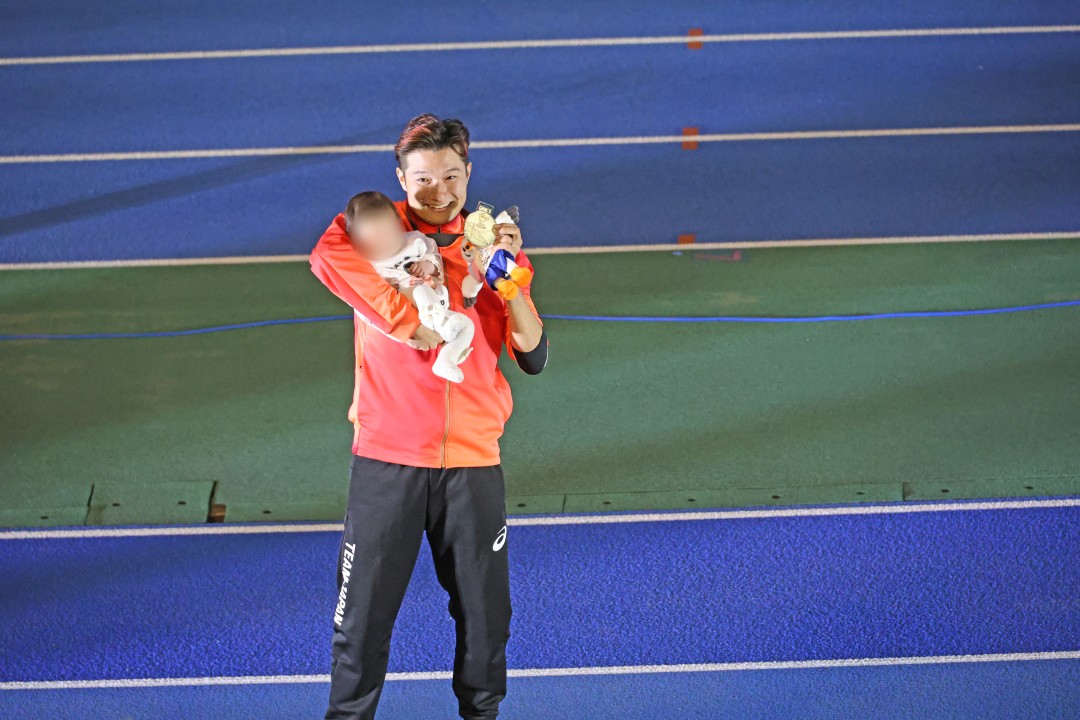 今年誕生したお子様と共に表彰台へ登る山田選手 パパアスリートとしての今後の活躍も期待しています