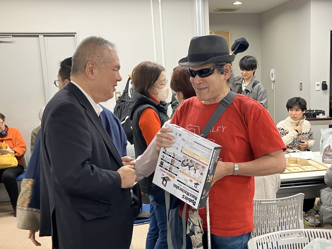 その後は、成績が上位の方から順にプレゼントを受け取っていきます。見えない方は見える方におもちゃの説明を聞きながら、受け取っていきました。
