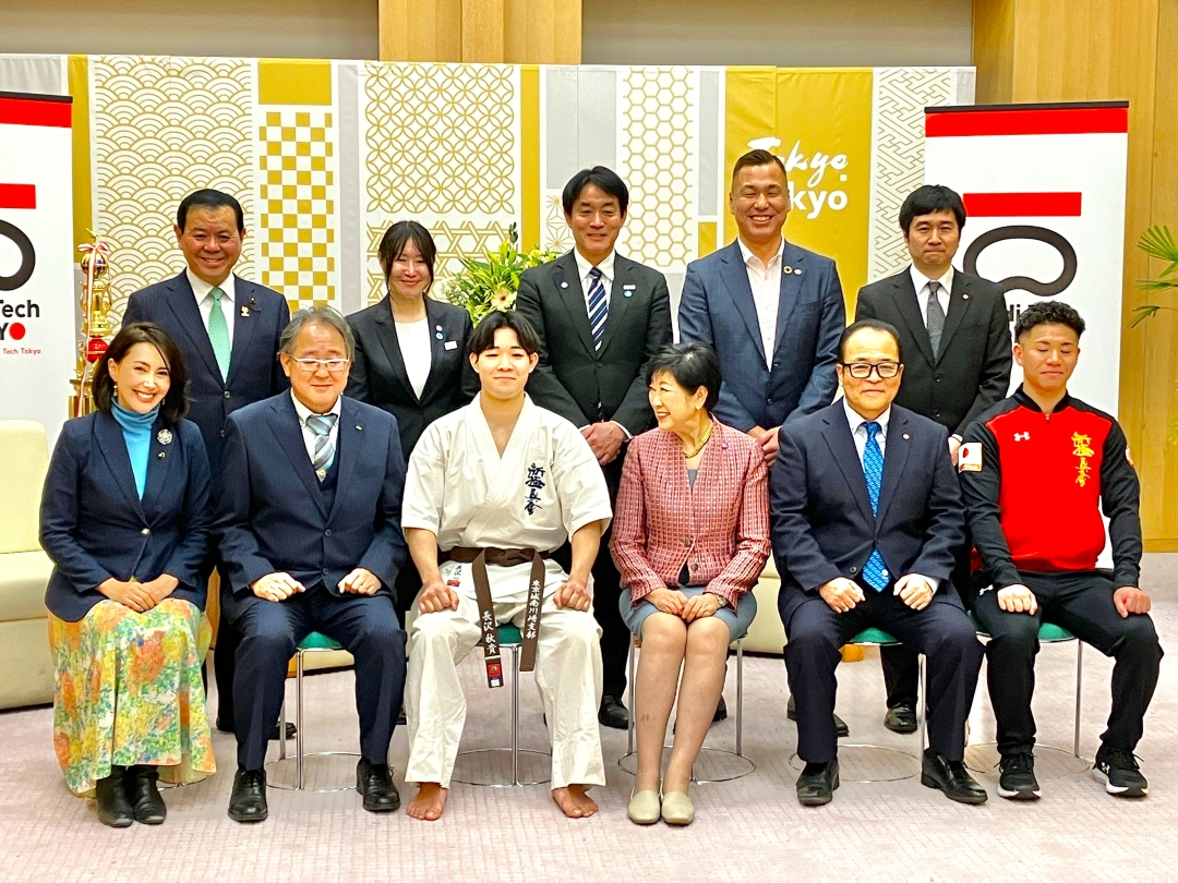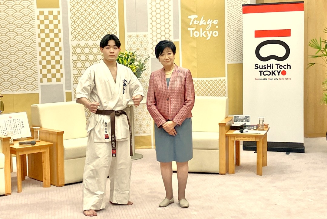 「押忍!」と元気な挨拶から始めた長沢秋貴選手は、都知事を表敬訪問する機会に感謝を述べ、優勝の報告とともに、新極真会に出会い、心も体も成長できた喜びを報告しました。
